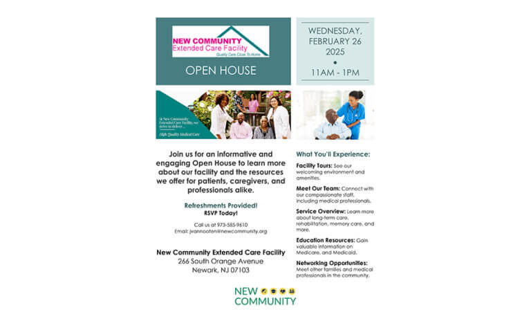 New Community Extended Care Facility will host an Open House on Wednesday, Feb. 26 from 11 a.m. to 1 p.m. at the facility, located at 266 South Orange Ave., Newark.