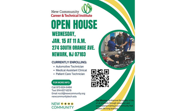 New Community Career & Technical Institute (NCCTI) will host an Open House on Wednesday, Jan. 15 at 11 a.m. at the school’s main campus, 274 South Orange Ave., Newark. Attendees